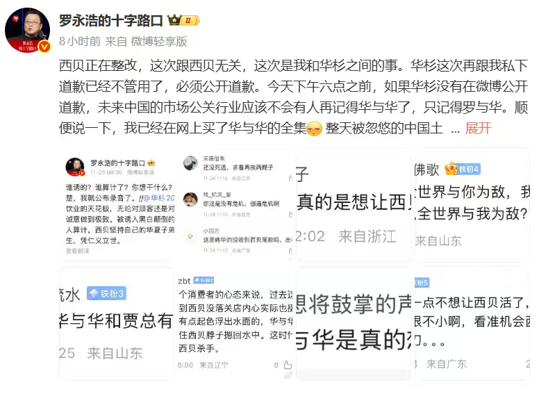 罗永浩还表示,“华杉这次再跟我私下道歉已经不管用了,必须公开道歉。今天下午六点之前,如果华杉没有在微博公开道歉,未来中国的市场公关行业应该不会有人再记得华与华了,只记得罗与华。”